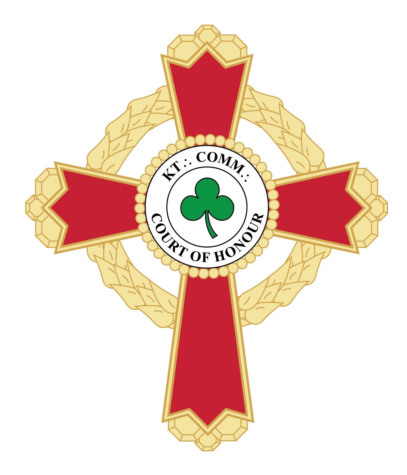 The cap of the Knight Commander Court of Honour is red with a darker red band trimmed in gold. In the center front is a representation of the Knight Commander Jewel, a Passion Cross with fancy arms, featuring in the center a trefoil embroidered in green encircled by “Kt.·. Comm.·. Court of Honour” embroidered in gold.